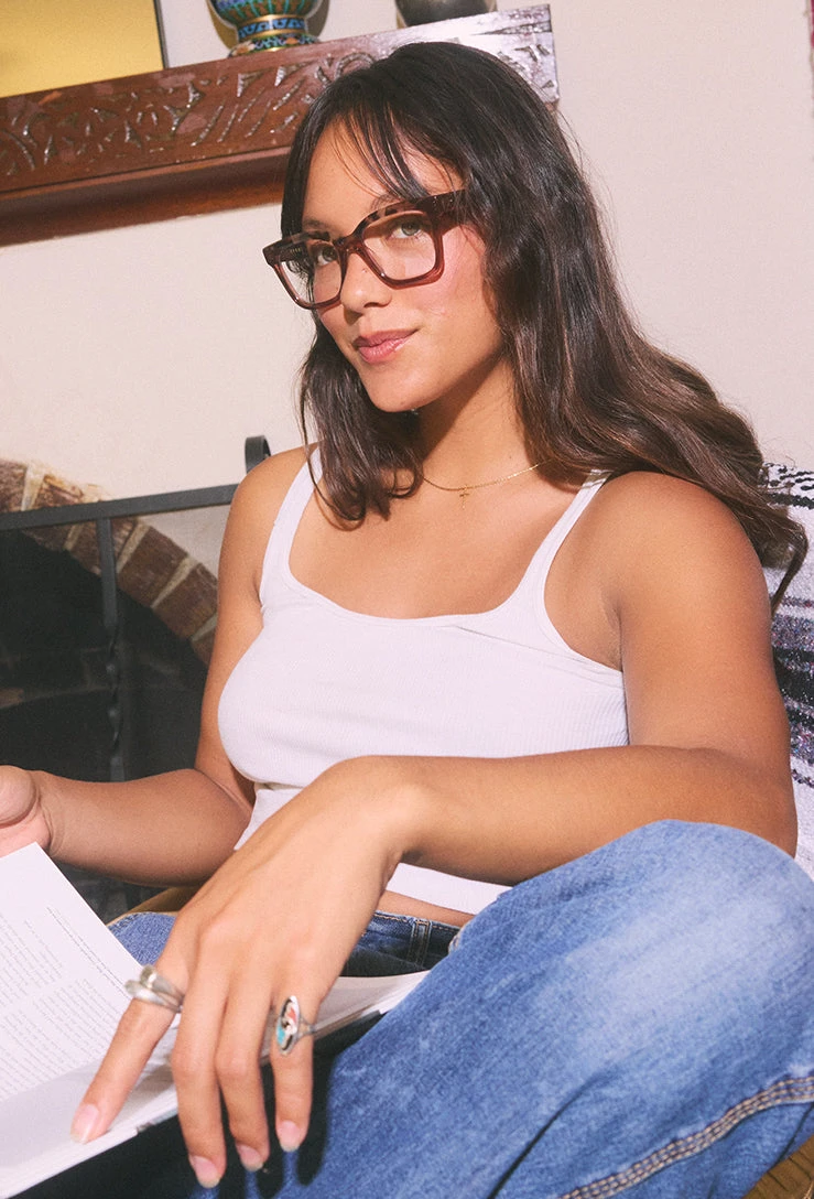 Hanny is a high-end, fashion-forward standout for our optical collection. The distinctive, articulated silhouette is highlighted by the contrasting lamination positioned at the center of the brow. The same laminate is also used on the temple tips, creating a cohesive look that’s both elegant and luxurious. The result is a big frame with a big personality.Â